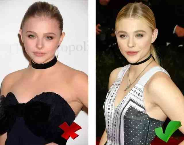 雖然長了一張小尖臉,但上半身肉肉多,溜肩、脖子短的“超殺女”。整個(gè)脖子都被寬Choker “吃掉了”,非要戴Choker 的話換成纖細(xì)款,就好很多。