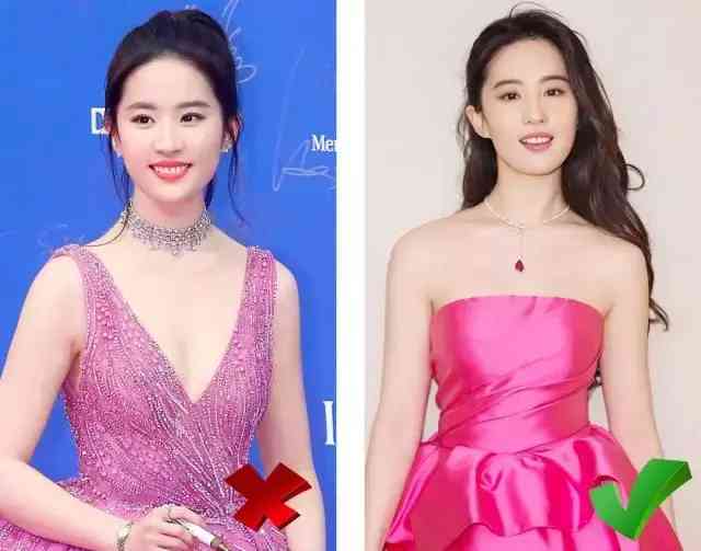 劉天仙的顏值毋庸置疑,其實(shí)脖子也算修長,溜肩可能是身材最大硬傷。同樣是帶卡脖子長度的珠寶,夸張的寬版雖然看起來更華麗,但是會(huì)放大溜肩的缺陷。