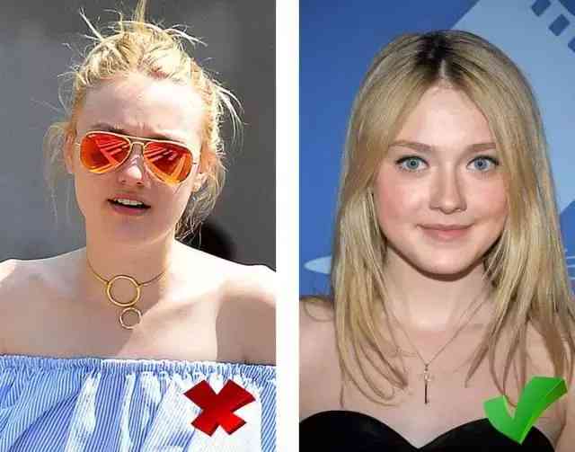 即使同樣是纖細(xì)精致款式,Dakota Fanning 戴著圓圈組合項(xiàng)鏈,也顯得臉更大了,換成有豎長款式對臉型修飾更明顯。
