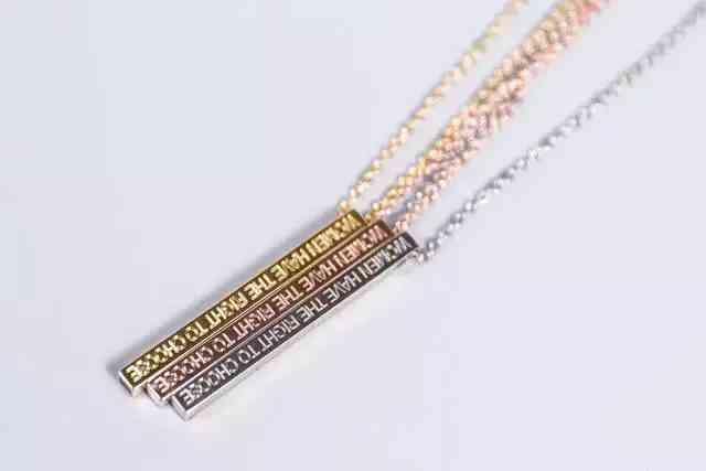 這款項(xiàng)鏈整體設(shè)計(jì)上是細(xì)鏈條+長方形吊墜,精致秀氣而且不挑臉型,吊墜上刻著一句鼓舞每一位女生的話:Women have the right to choose。
