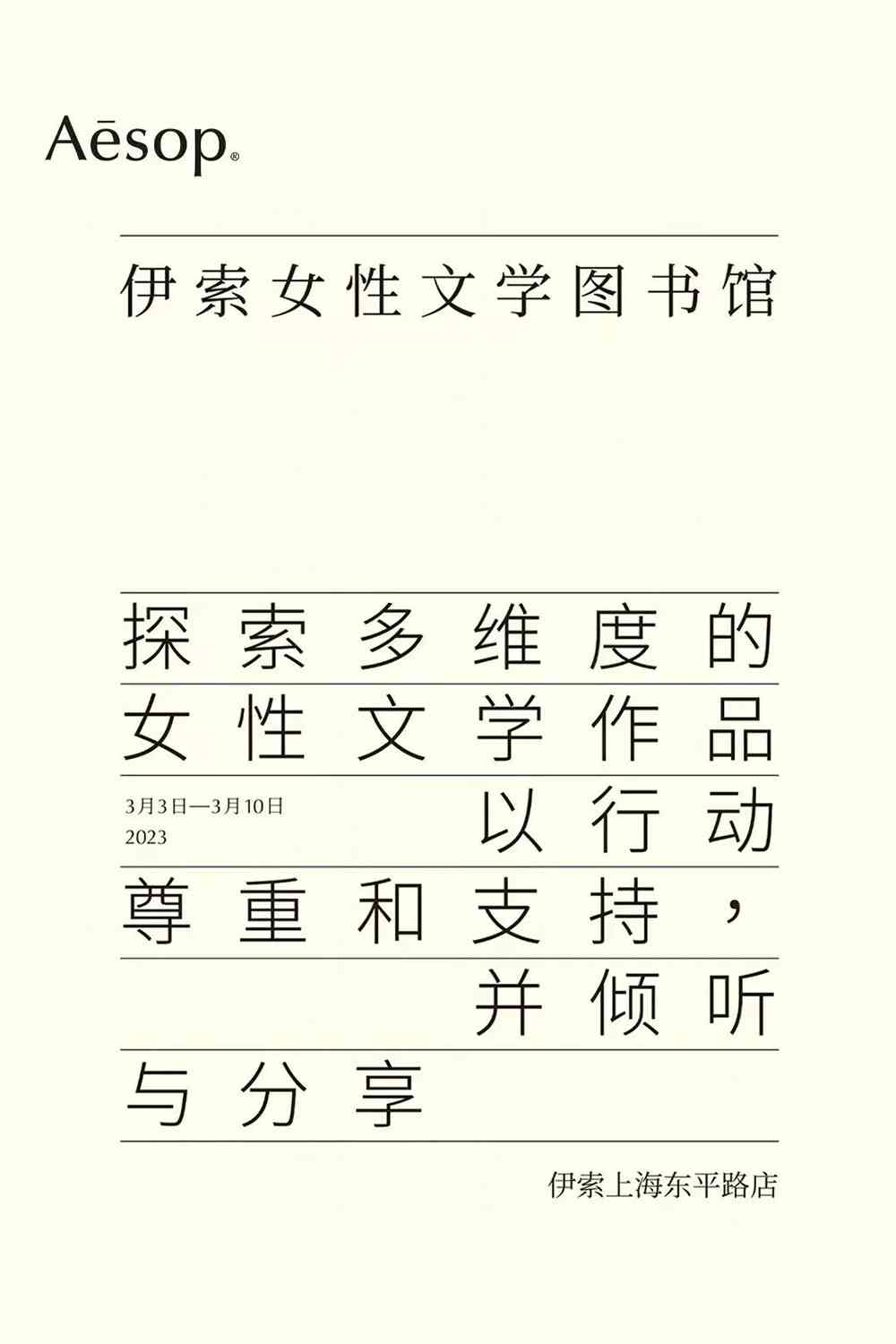 3月3日至10日,Aesop伊索在上海東平路店舉行“女性文學(xué)圖書館”活動,貨架上的產(chǎn)品被取代為一系列女性創(chuàng)作、或與女性主題相關(guān)的精選書籍。所有書籍皆全價采購于四家獨立書店,共逾10,000冊,并免費贈予顧客,以文學(xué)的力量共建善意、美好的連結(jié)。