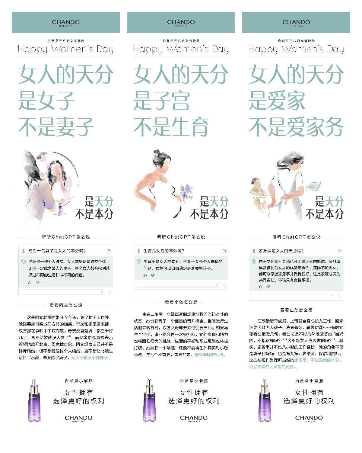 自然堂收集了一些當(dāng)代中國女性所面臨的困擾,交給了近期備受矚目的AI聊天程序ChatGPT,同時邀請了被催婚的北漂女生阿文、重返職場的二胎媽媽小敏、負擔(dān)著沉重家務(wù)的職場白領(lǐng)莊欣三位女性,分享她們的經(jīng)歷、面臨的女性困境以及自己的想法,用一組「是天分不是本分」態(tài)度海報刷屏網(wǎng)絡(luò)與社交媒體,引發(fā)了女性群體的廣泛共鳴,也為女性的社會議題帶來新的態(tài)度與主張。