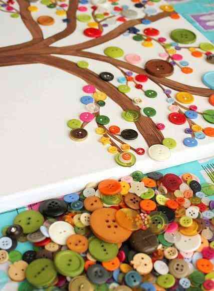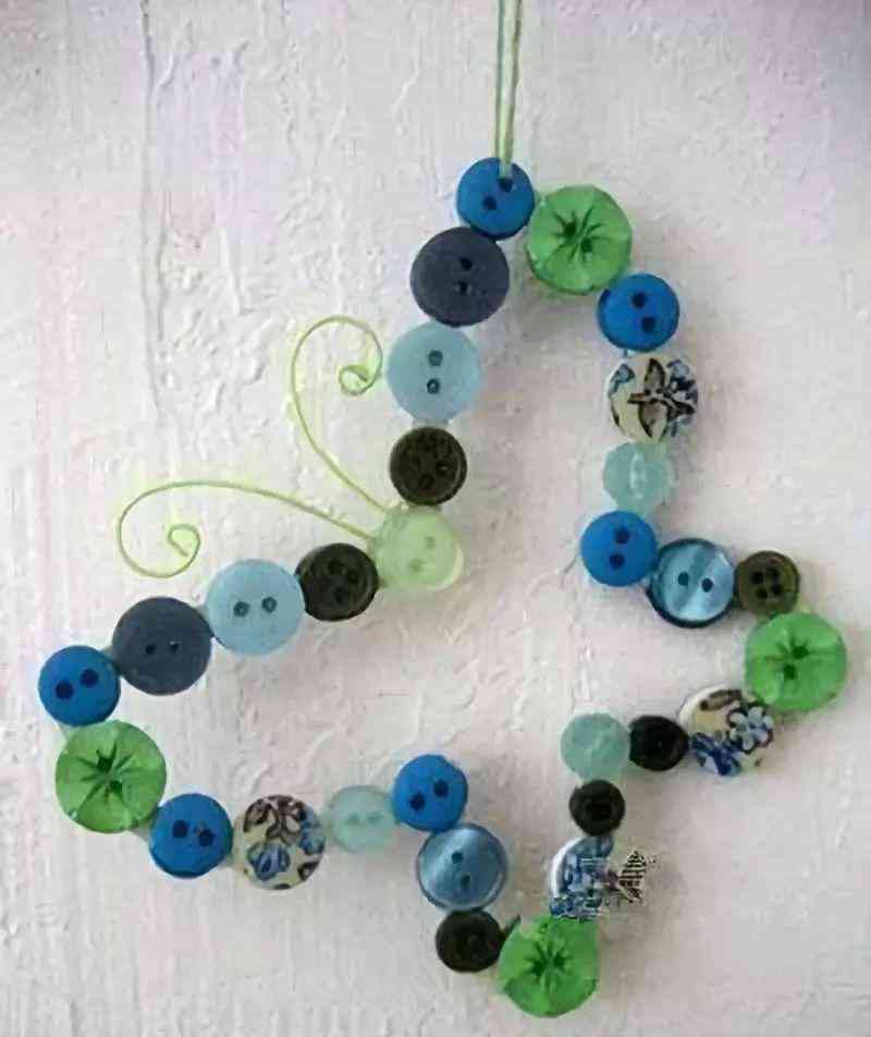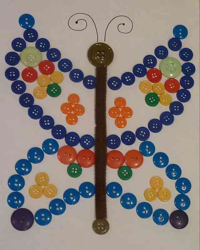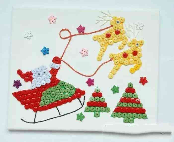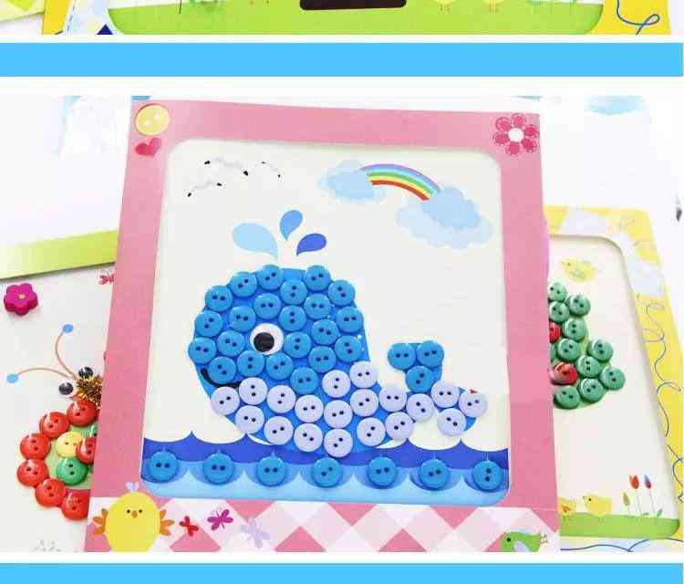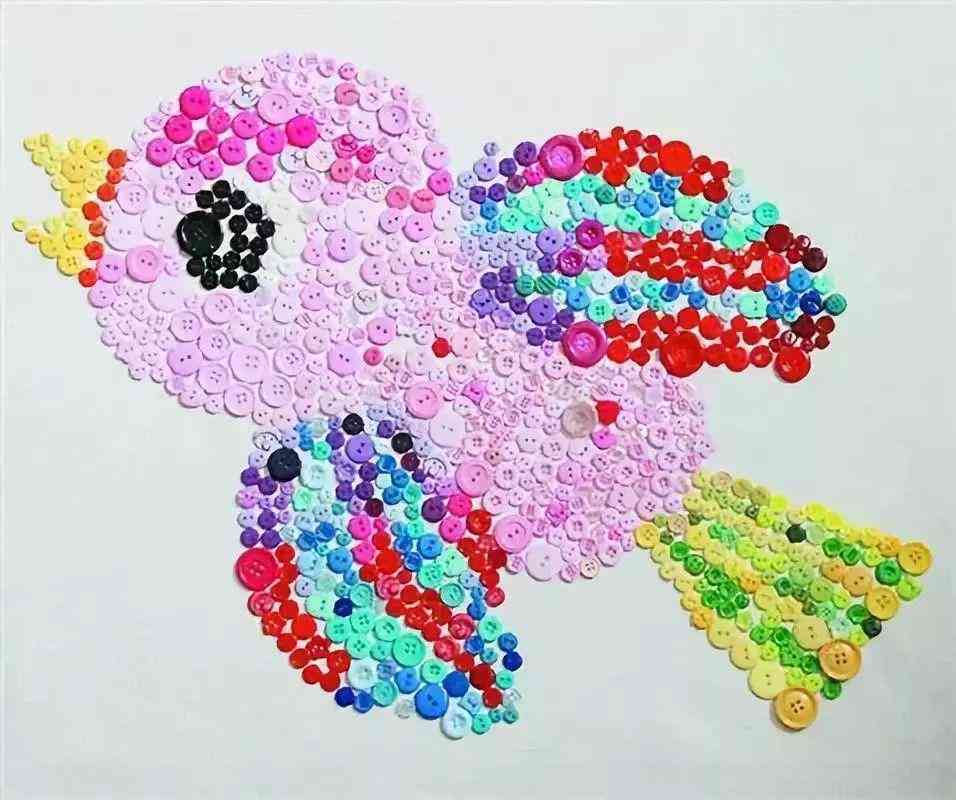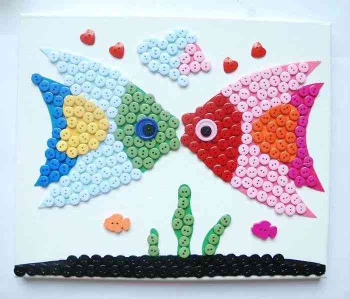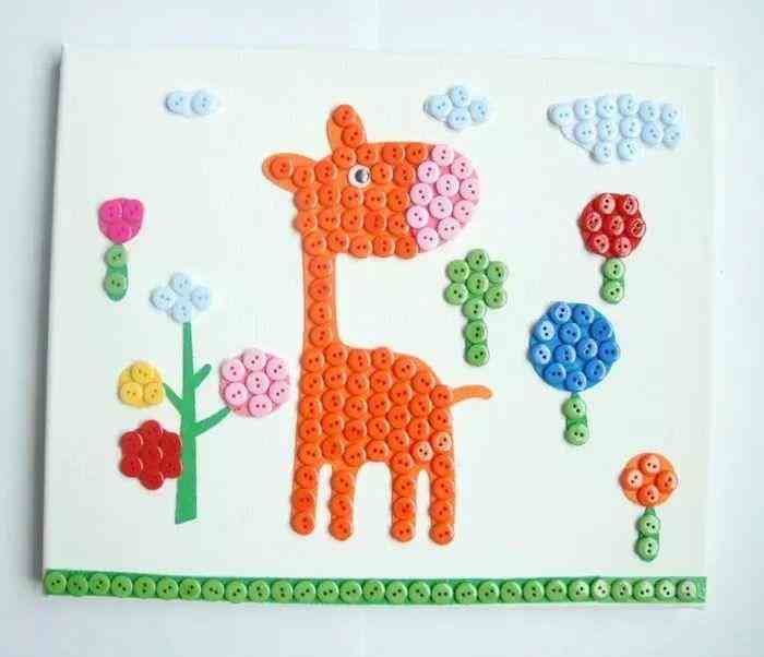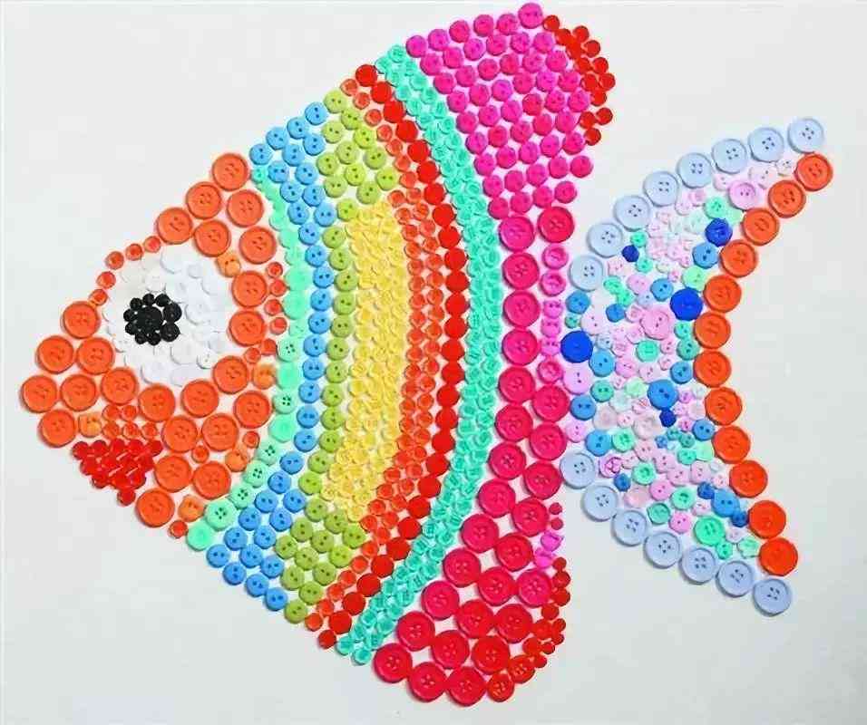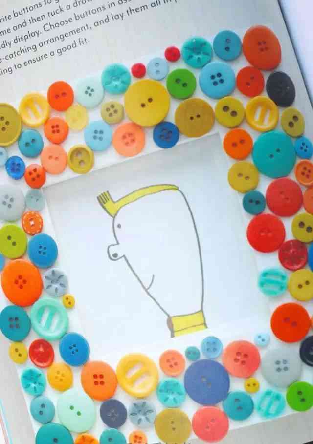 紐扣畫——不用畫筆、不用顏料,只需將一堆色彩鮮艷的紐扣,拼擺成你喜歡的圖案,用膠水固定就OK啦!蝴蝶、房屋、海馬……你想到什么就可以擺什么。