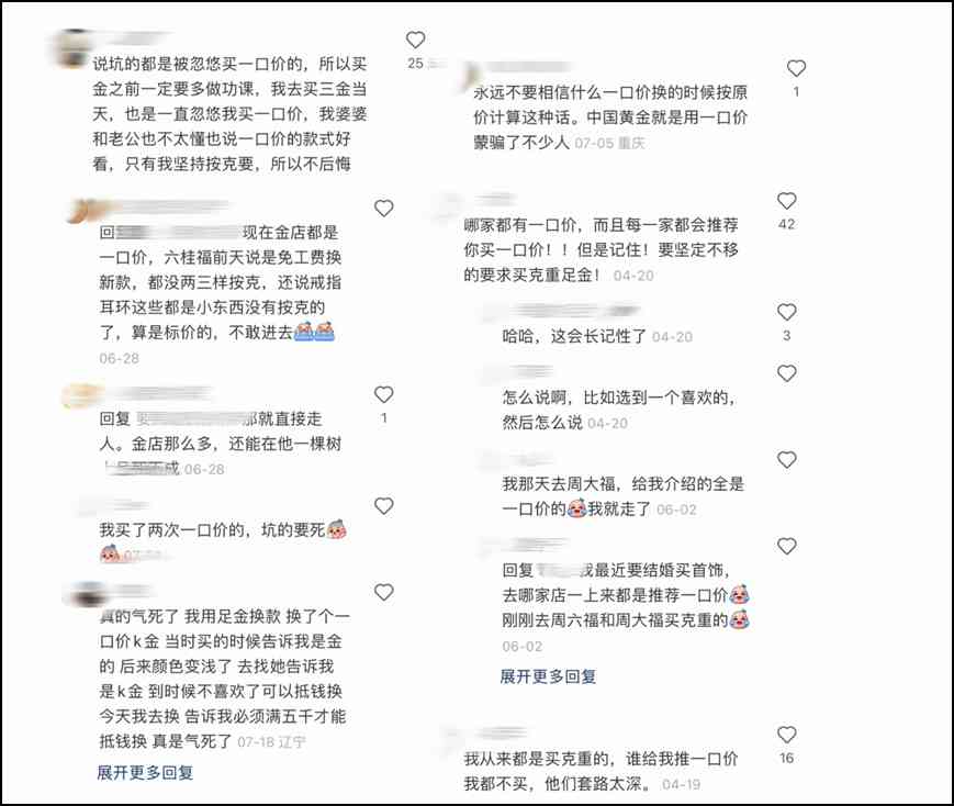 有網友爆料,在中國黃金門店購買金飾時,即使有按克賣的金飾,柜員也一定是首先為客戶強烈推薦“一口價”商品,且店內許多金飾以“一口價”金飾居多。另外,會利用“可等價置換”等話術引導消費。等到消費者購買后,打算置換時才發(fā)現(xiàn)自己被坑了。甚至有網友表示,中國黃金門店的“一口價”銷售形式比其他金店更普遍。
