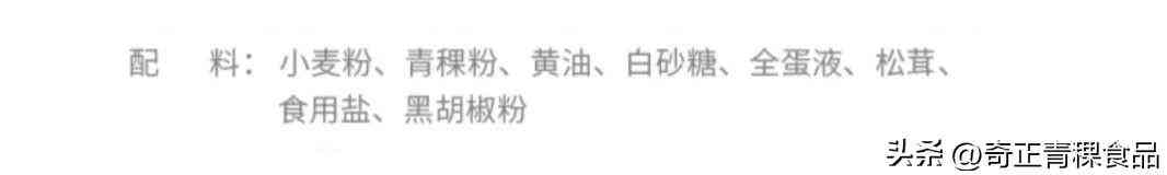 以奇正青稞高纖餅干為例,看配料表可得到以下幾點信息: