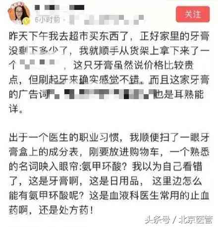 換句話說,功效型牙膏可以輔助口腔護理,但不能替代口腔醫(yī)生的專業(yè)治療,通過氨甲環(huán)酸止血只是治標不治本。應急或許可以,但長期使用,不建議!