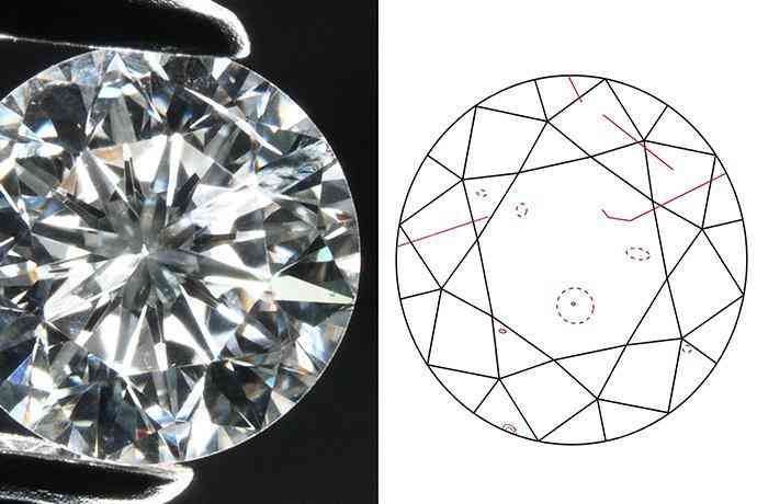 凈度分布圖是用不同符號(hào)去定位和描述鉆石包裹體的位置和類型,并不是說,凈度分布圖上有一個(gè)橢圓形虛線,而鉆石身上就會(huì)有橢圓形這么大面積的一個(gè)包裹體。
