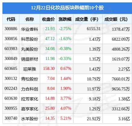 12月22日化妝品板塊較上一交易日上漲4.26%,上海家化領(lǐng)漲。當(dāng)日上證指數(shù)報收于3054.43,下跌0.46%。深證成指報收于10876.31,下跌0.33%?;瘖y品板塊個股漲跌見下表: