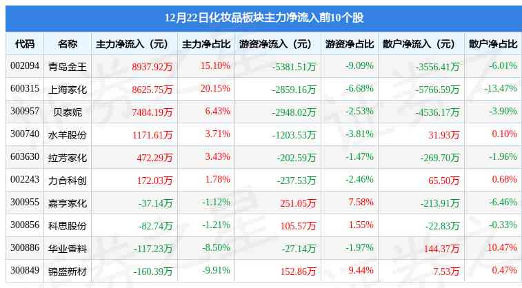 從資金流向上來看,當(dāng)日化妝品板塊主力資金凈流入2.48億元,游資資金凈流出1.16億元,散戶資金凈流出1.32億元?;瘖y品板塊個股資金流向見下表: