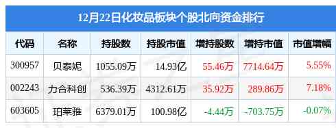 北向資金方面,當(dāng)日化妝品板塊北向資金持股市值為116.35億元,增持0.73億元。其中增持最多的是貝泰妮,增持了0.77億元。減持持最多的是珀萊雅,減持了703.75萬元?;瘖y品板塊北向資金持股變動明細(xì)見下表: