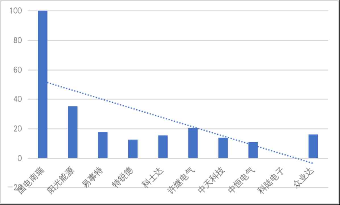 在品牌優(yōu)勢(shì)值方面,與其它企業(yè)相比,國(guó)電南瑞在“新能源充電樁”行業(yè)處于首位,按指數(shù)計(jì)算,國(guó)電南瑞2021年品牌優(yōu)勢(shì)值為100,居于行業(yè)首位。但也能夠看到,該行業(yè)內(nèi)品牌優(yōu)勢(shì)值處于一家獨(dú)大的狀態(tài),除國(guó)電南瑞與其它企業(yè)拉開了巨大差距外其余企業(yè)評(píng)分相差不大,說(shuō)明頭部效應(yīng)明顯。