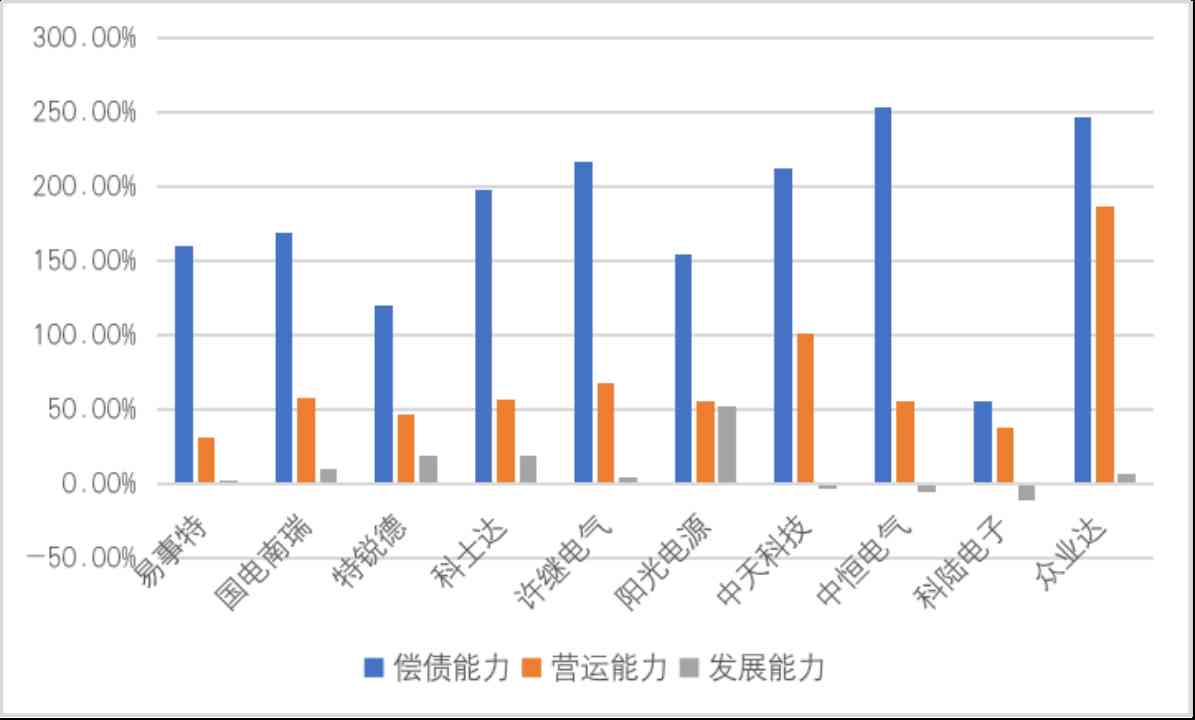——財(cái)務(wù)能力表現(xiàn)中等偏上。2021年國(guó)電南瑞的償債能力為169.66%,而中恒電氣的償債能力為254.12%,為行業(yè)最高,在十家新能源充電樁企業(yè)中,國(guó)電南瑞的償債能力排在中等水平。在營(yíng)運(yùn)能力方面,眾業(yè)達(dá)以187.18%的總資產(chǎn)周轉(zhuǎn)率位于十家企業(yè)營(yíng)運(yùn)能力之首,國(guó)電南瑞的總資產(chǎn)周轉(zhuǎn)率為58.17%,同樣處于行業(yè)中等靠前的位置。盈利能力方面,2021年新能源充電樁賽道內(nèi)各企業(yè)的凈資產(chǎn)收益率差別不大,國(guó)電南瑞的凈資產(chǎn)收益率為15.7%,居于行業(yè)首位。最后在發(fā)展能力方面,國(guó)電南瑞總資產(chǎn)增長(zhǎng)率為10.26%,行業(yè)最高值為陽(yáng)關(guān)能源的52.98%,國(guó)電南瑞的發(fā)展能力一般。
