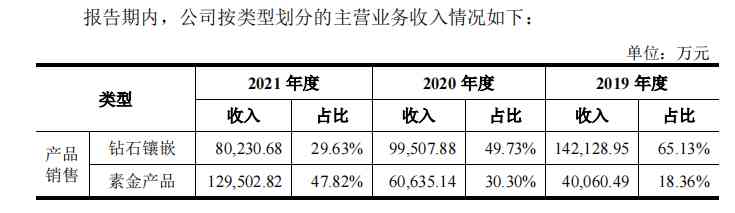 從具體產(chǎn)品的銷售收入來(lái)看,周六福主營(yíng)業(yè)務(wù)收入主要來(lái)自鉆石鑲嵌產(chǎn)品及素金產(chǎn)品的銷售,以及包括向加盟商收取的特許經(jīng)營(yíng)費(fèi)和品牌使用費(fèi)。2020年,公司鉆石鑲嵌類產(chǎn)品的銷售在主營(yíng)業(yè)務(wù)中占主導(dǎo),占比也高達(dá)約50%以上。2021年,鉆石鑲嵌類產(chǎn)品的銷售比例從2019年的65.13%跌至29.63%,跌幅達(dá)35.5%。而黃金作為貴金屬,在疫情和國(guó)際金價(jià)等多重因素的影響下,其避險(xiǎn)屬性受到了人們的青睞。2021年,周六福素金產(chǎn)品的銷售額從2020年的6.06億元猛增至12.95億元。