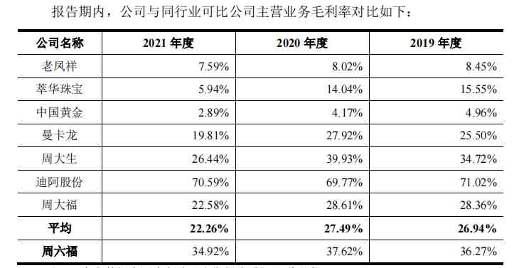 根據(jù)招股書(shū)中的介紹,公司毛利率高于同行,主要系銷售模式及產(chǎn)品結(jié)構(gòu)存在一定差異所致。而2019 年及2020年,公司經(jīng)營(yíng)模式、產(chǎn)品結(jié)構(gòu)與周大生相似,但同期毛利率比周大福高7.91個(gè)百分點(diǎn)、9.01個(gè)百分點(diǎn)。即使2021年公司調(diào)整了經(jīng)營(yíng)模式,毛利率較低的素金類產(chǎn)品占比提升,但公司的毛利率仍比同行平均水平高出12.66個(gè)百分點(diǎn),比周大福高出12.34個(gè)百分點(diǎn)。
