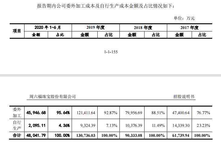 從產(chǎn)品的生產(chǎn)模式來(lái)看,周六福也多是采用的委外加工,只有少量自行生產(chǎn)。從2020年披露的招股書(shū)中看到,在生產(chǎn)加工成本上,2017年至2020年1—6月,委外加工成本占比為76.77%、88.51%、92.87%、95.64%。可見(jiàn),周六福在委外加工的投入遠(yuǎn)遠(yuǎn)大于自行生產(chǎn)。
