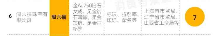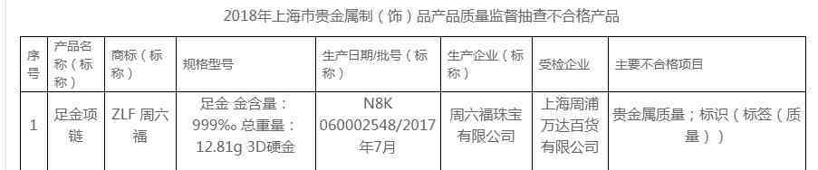 例如,2018年,上海市市場(chǎng)監(jiān)督管理局發(fā)布抽檢情況,共抽查產(chǎn)品76批次,經(jīng)檢驗(yàn),不合格2批次,周六福為其中之一。其中上海萬(wàn)達(dá)百貨的周六福店內(nèi)足金項(xiàng)鏈不合格,不合格項(xiàng)目:貴金屬質(zhì)量;標(biāo)識(shí)(標(biāo)簽(質(zhì)量))。