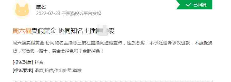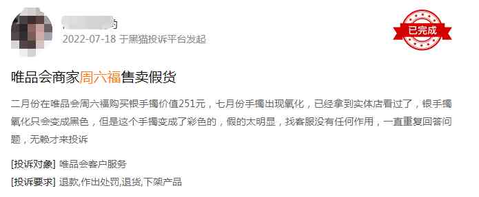 在黑貓投訴上,我們也可以看到許多關(guān)于周六福的投訴。有消費(fèi)者反映在抖音上、唯品會(huì)等平臺(tái)上買到假黃金、假銀手鐲;還有消費(fèi)者投訴周六福的產(chǎn)品質(zhì)量差,“在線下門店買的鉆戒,一年沒(méi)到鉆石掉了”。在平臺(tái)上,諸如此類的投訴并不少。