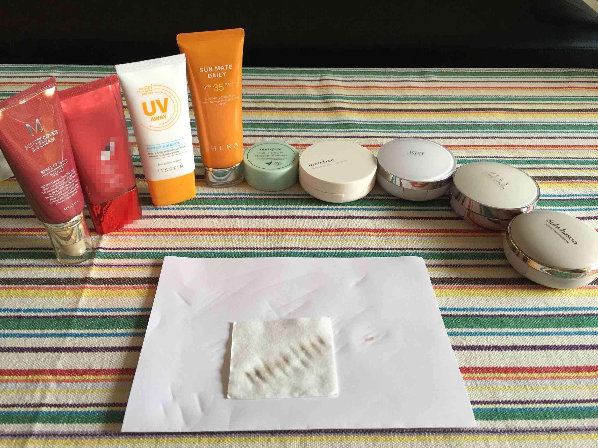 接下來,樓樓依次測試了it’sskin防曬、赫拉防曬、悅詩風(fēng)吟氣墊、悅詩風(fēng)吟定妝粉、iope氣墊、赫拉氣墊、雪花秀氣墊
