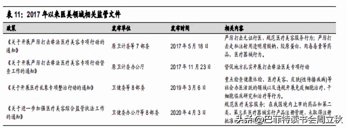 2020年的八部委聯(lián)合頒布醫(yī)美綜合監(jiān)管執(zhí)法通知:由“嚴厲打擊非法整形”過渡到“嚴格整頓醫(yī)美行業(yè)”,主要從四大方面加強監(jiān)管,進一步凈化了醫(yī)療美容市場。有望肅清本源,推動醫(yī)美行業(yè)和規(guī)劃發(fā)展。