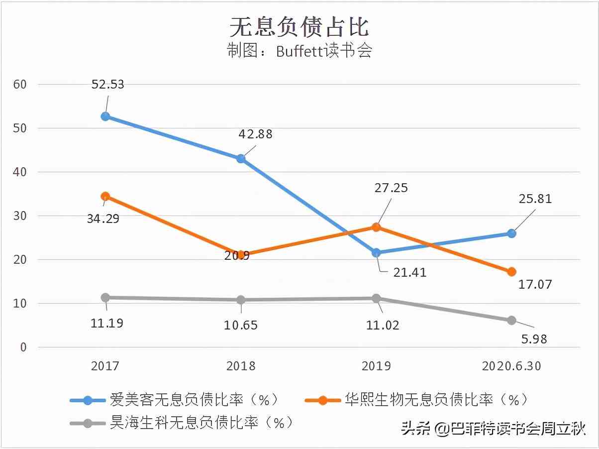 在資產(chǎn)負債率這個指標(biāo)上我們已經(jīng)發(fā)現(xiàn)三家公司的負債都不高,再細看的話,其中愛美客的無息負債占比在2020年中報時是最好的,昊海生科近幾年都維持在10%左右,比較平穩(wěn)。