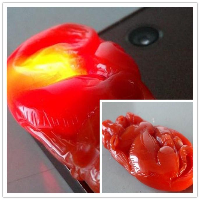 蒙料的質(zhì)地差,石性較強(相互碰撞能感覺到脆性),鑒別特征是內(nèi)部綹裂明顯比纏絲多,紅色的地方?jīng)]有南紅那么潤,相對色暗,有時伴有草綠色的瑪瑙以及水晶等雜質(zhì),透明的地方不夠純凈,大多蒙料也是需要注膠處理的。