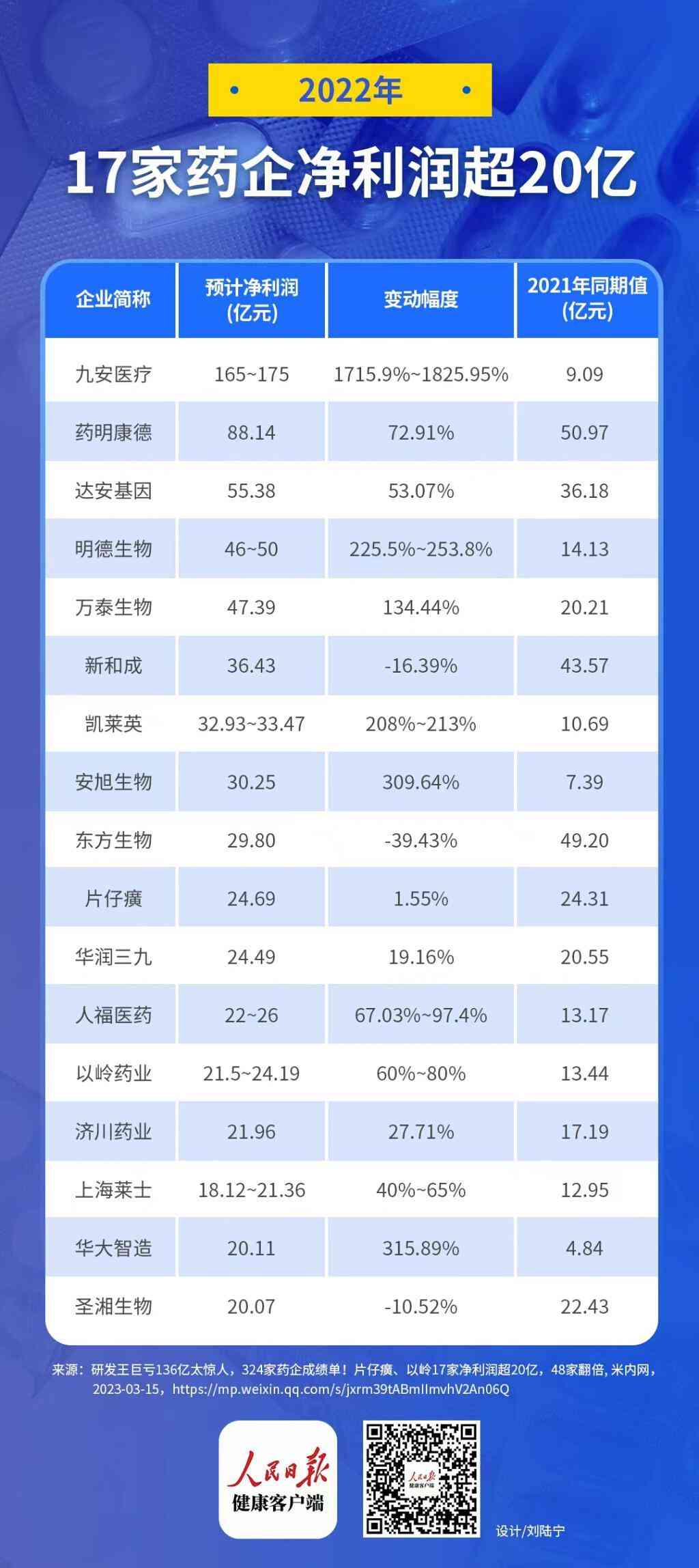 2022年17家藥企凈利潤超20億 截至目前,有12家醫(yī)藥企業(yè)年報已浮出水面,137家業(yè)績快報、175家業(yè)績預告,超5成報喜??稻壦帢I(yè)是披露年報的藥企,藥明康德、達安基因、片仔癀、以嶺藥業(yè)等17家凈利潤超過20億元;華人健康、川寧生物、昭衍新藥等48家翻倍,其中26家增速超過200%。此外,有95家虧損,百濟神州虧損最大,達136億元。