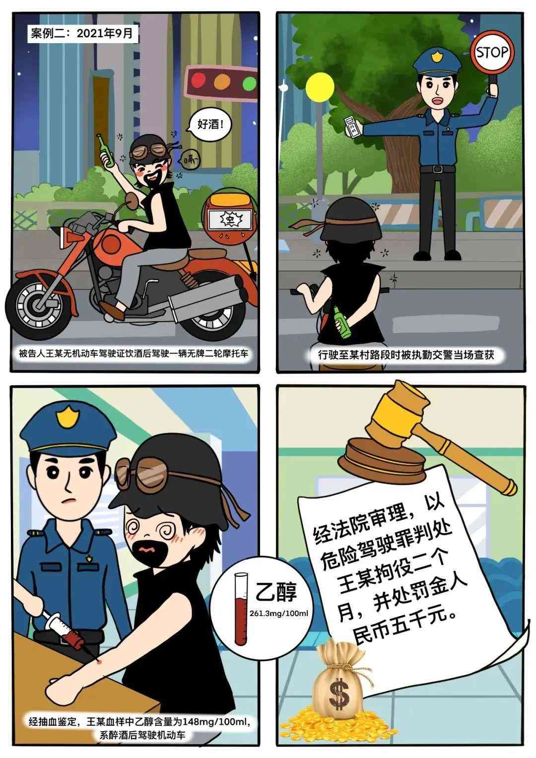 2021年9月,被告人王某無機(jī)動(dòng)車駕駛證飲酒后駕駛一輛無牌二輪摩托車,行駛至某村路段時(shí)被執(zhí)勤交警當(dāng)場查獲。經(jīng)抽血鑒定,王某血樣中乙醇含量為148mg/100ml,系醉酒后駕駛機(jī)動(dòng)車。法院經(jīng)審理以危險(xiǎn)駕駛罪判處王某拘役二個(gè)月,并處罰金人民幣五千元。