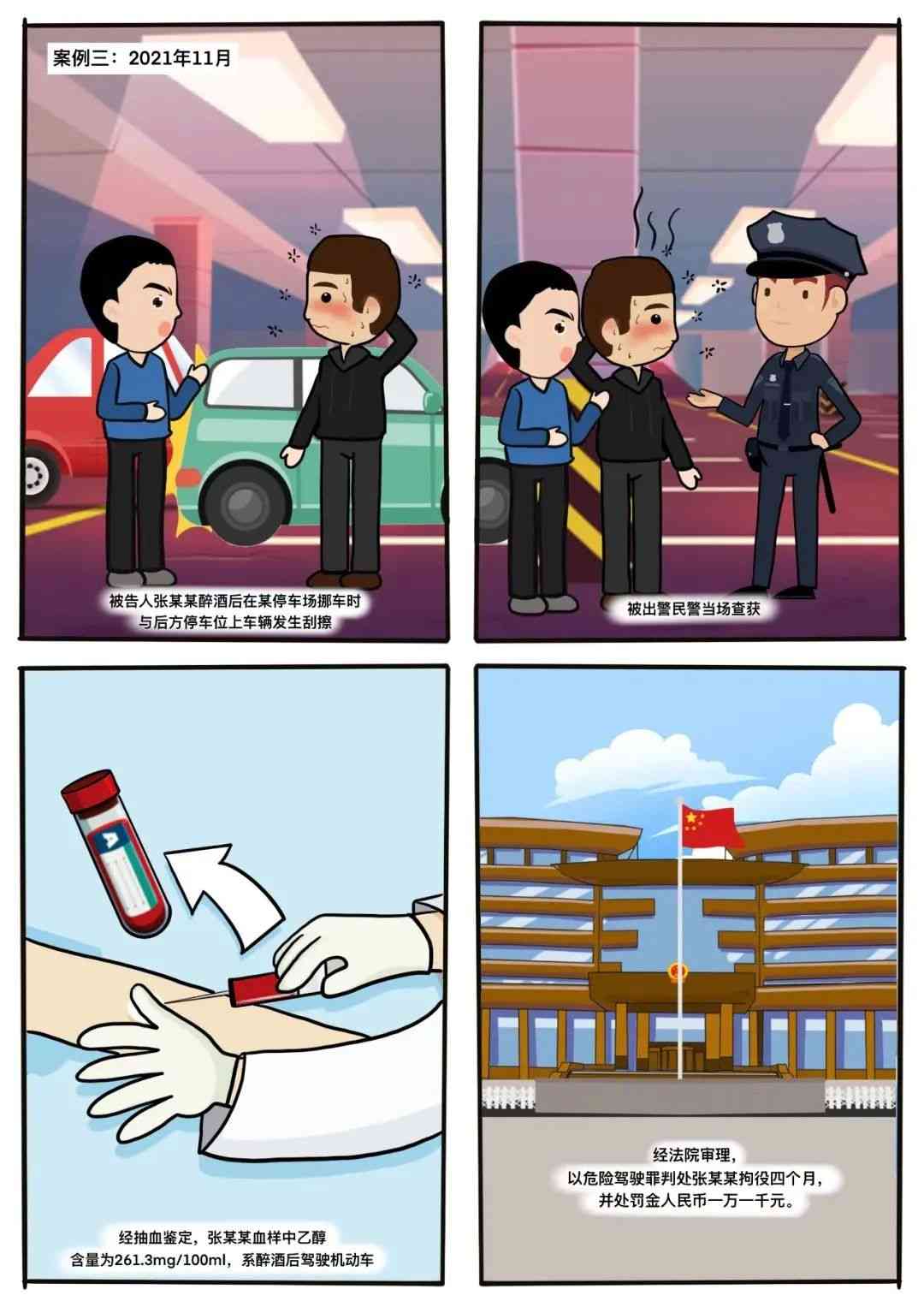 2021年11月,被告人張某某醉酒后在某停車場挪車時(shí),與后方停車位上車輛發(fā)生刮擦,被出警民警當(dāng)場查獲。經(jīng)抽血鑒定,張某某血樣中乙醇含量為261.3mg/100ml,系醉酒后駕駛機(jī)動(dòng)車。法院經(jīng)審理以危險(xiǎn)駕駛罪判處張某某拘役四個(gè)月,并處罰金人民幣一萬一千元。