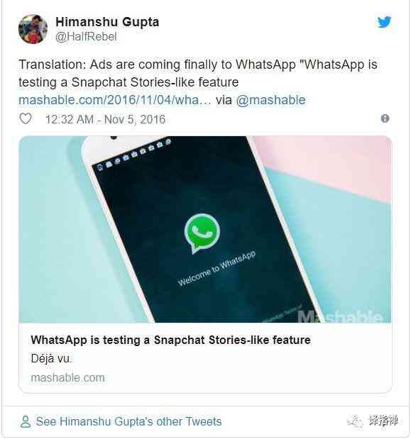 WhatsApp是一個月度活躍用戶超過十億卻尚未開始變現(xiàn)的信息流應(yīng)用。2016年11月,WABetaInfo 網(wǎng)站報道了WhatsApp測試版發(fā)布的新功能,據(jù)稱WhatsApp將推出類似于Snapchat Stories的功能,我當(dāng)時就覺得這個有趣的功能有助于WhatsApp的廣告變現(xiàn),而這一預(yù)測在2018年8月成為現(xiàn)實(shí),具體可以在我的Facebook和Twitter上看到。