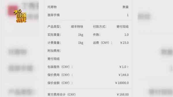 這是當時的運單,蔡女士支付了144元的保價費用,保價金額是18000元,加上運費和服務(wù)費一共是168元?,F(xiàn)在手鐲有裂痕,蔡女士要求順豐按照保價賠付。