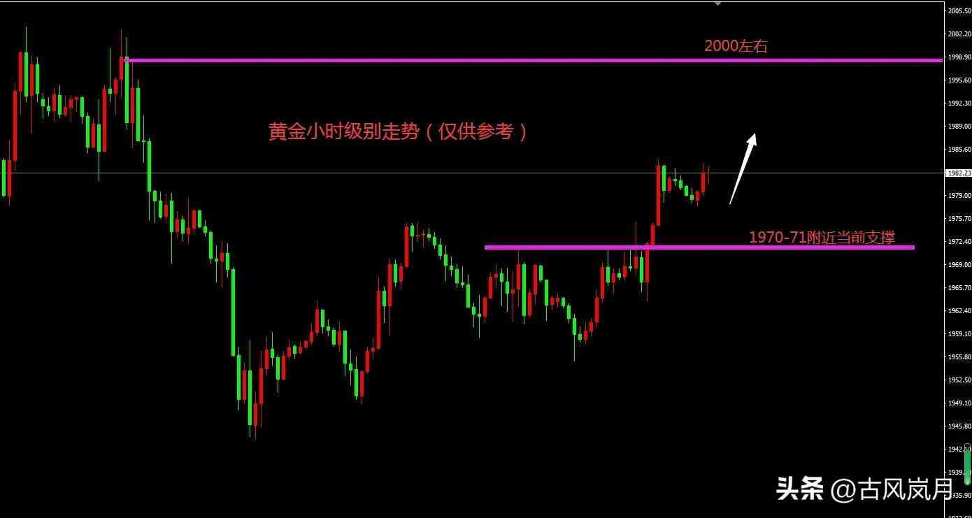二.技術(shù)面,1 黃金簡單的看下今天走勢(shì),日線級(jí)別來看當(dāng)前形成陽包陰結(jié)構(gòu),今天行情有望先進(jìn)一步上行,小時(shí)級(jí)別看昨天突破站上1970-71一線后持續(xù)在此位置上方運(yùn)行,當(dāng)前價(jià)格1982上下,今天個(gè)人短線觀點(diǎn)晚上數(shù)據(jù)重點(diǎn)關(guān)注,數(shù)據(jù)前行情回撤1975-77附近嘗試短多,止損1970即可,目標(biāo)上看1990,第二目標(biāo)1995附近。上周末周前預(yù)測(cè)里面我的觀點(diǎn)里說過本周行情大概率會(huì)在2000-1960-1930區(qū)間運(yùn)行,到目前為止基本符合預(yù)期,當(dāng)前來說就是日內(nèi)短線操作點(diǎn)位和時(shí)機(jī)的問題,當(dāng)然晚上如果數(shù)據(jù)表現(xiàn)不錯(cuò)利空的話,晚上行情如果真沖擊到2000關(guān)口不破2005一線也是有機(jī)會(huì)再度嘗試空的,或許還能再次演變成小中線,這里只是猜測(cè),客觀點(diǎn)畢竟主要還是需要看下今天數(shù)據(jù)表現(xiàn)如何