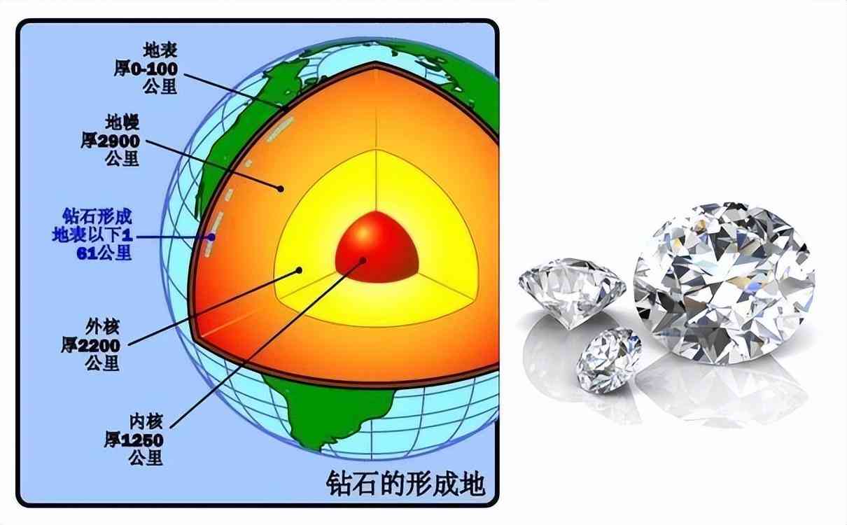 天然鉆石形成于地球內(nèi)部的高溫、高壓和無氧的環(huán)境下。一般壓力在4.5-6.0Gpa,相當(dāng)于地下150-200km的深度,溫度為1100-1500℃。形成過程長達(dá)數(shù)萬年。