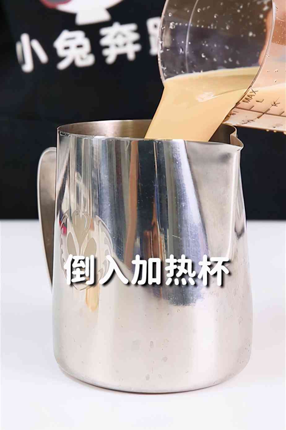 第3步,將雪克杯中原料倒入不銹鋼加熱杯中,加熱到55至60度