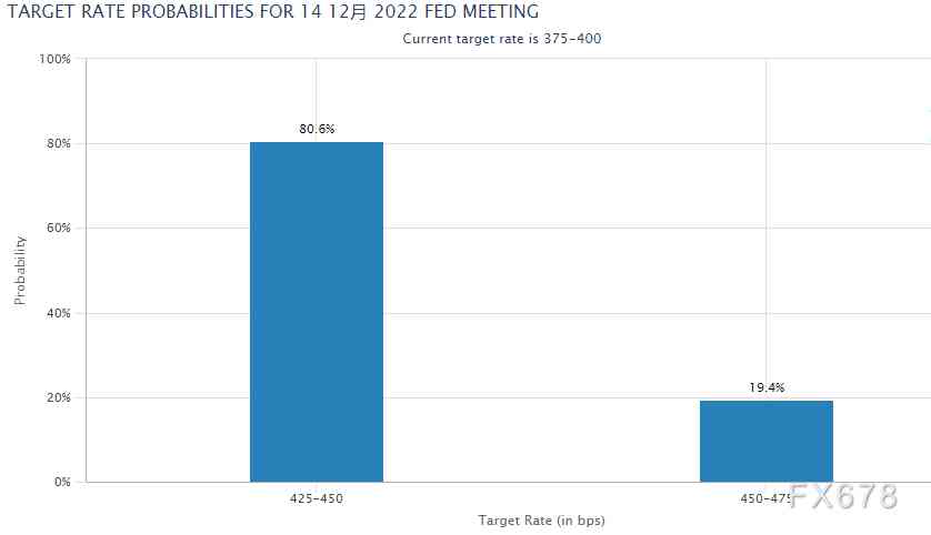 市場(chǎng)參與者現(xiàn)在認(rèn)為,美聯(lián)儲(chǔ)在12月會(huì)議上至少加息50個(gè)基點(diǎn),但連續(xù)第五次加息75個(gè)基點(diǎn)的可能性不到20%。黃金被視為通脹對(duì)沖工具,但利率上升會(huì)增加持有非孳息資產(chǎn)黃金的機(jī)會(huì)成本。
