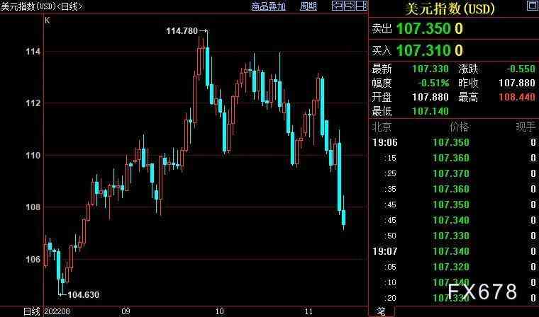 因美國10月份CPI降溫程度超過預(yù)期,這給人們帶來了希望,即幾十年來最快的物價(jià)上漲正在消退,并給美聯(lián)儲(chǔ)提供了放緩激進(jìn)加息的空間,美元指數(shù)暴跌逾3%,刷新8月18日以來低點(diǎn)至107.095。