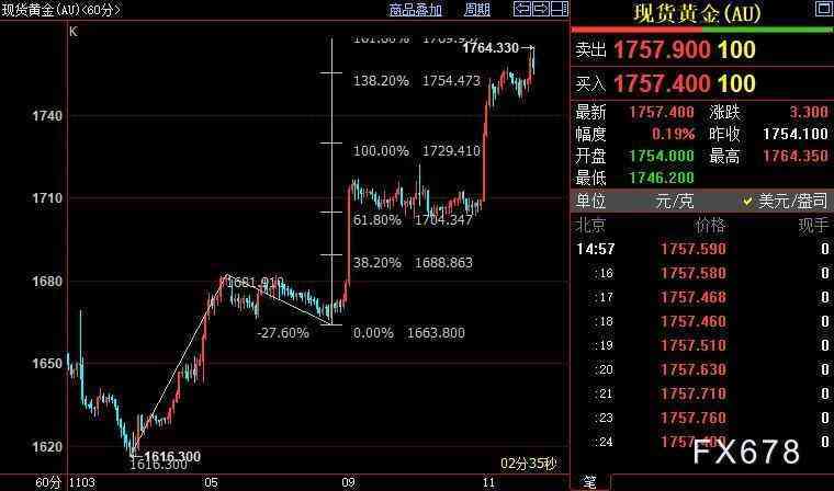 截至發(fā)稿,現(xiàn)貨黃金上漲4.70%至1760.08美元/盎司;COMEX期金主力合約上漲4.60%%至1763.1美元/盎司;美元指數(shù)下跌3.32%%至107.108。