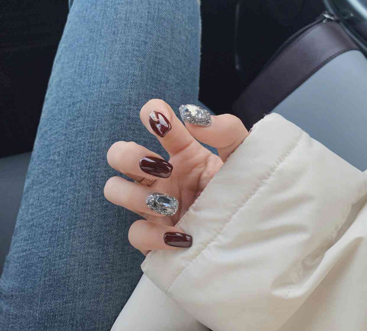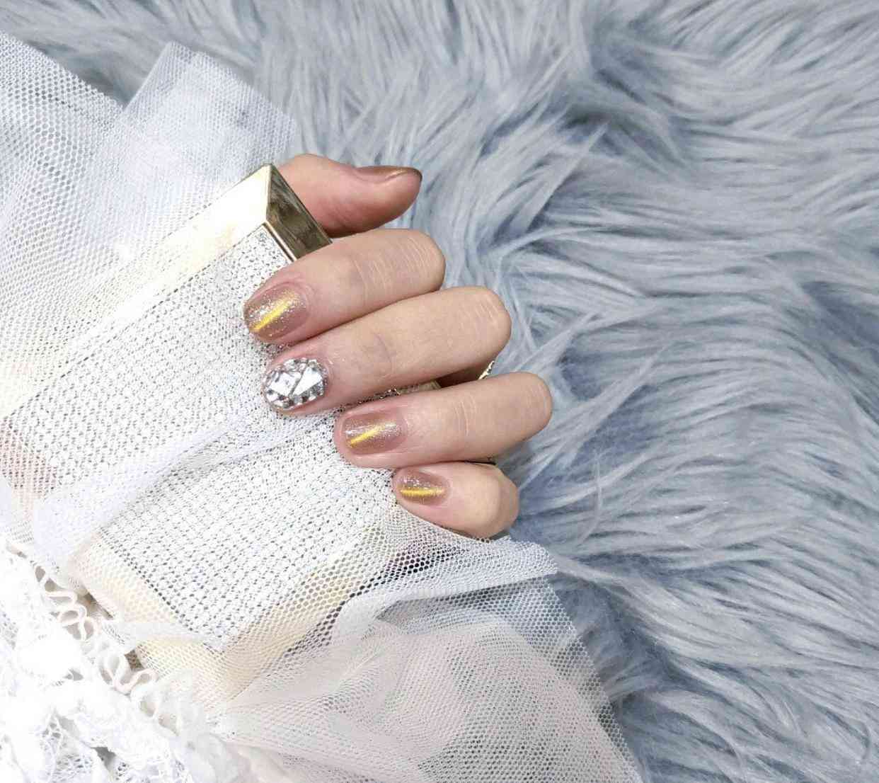 另外,我們除了用清一色的純色美甲來搭配滿鉆美甲以外,也可以用貓眼甲來搭配滿鉆美甲,貓眼甲的獨(dú)特發(fā)光效果,也可以增加甲面的豐富性,同時(shí)因?yàn)樨堁奂子兄秸募酌妫圆⒉粫?huì)打破這種簡約清爽的質(zhì)感,而且顏值也變高了很多哦,閃亮又時(shí)髦,超有氣質(zhì)的!