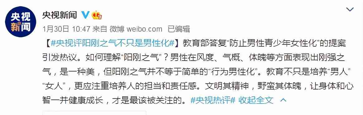 央視新聞也評論:教育不只是培養(yǎng)“男人”“女人”。