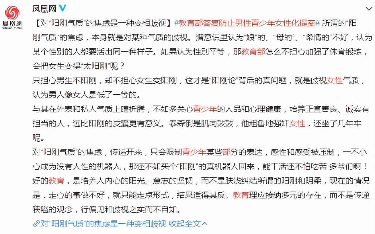 鳳凰網(wǎng)更是表示:對“陽剛氣質(zhì)”的焦慮是一種變相歧視!