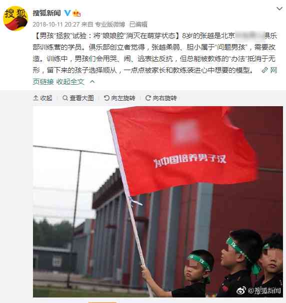 2018年,就有媒體報道過,北京還存在著這樣標(biāo)榜“拯救男孩”和“將‘娘娘腔’消滅在萌芽狀態(tài)”的俱樂部。在這里,很多男孩子愛哭、怕累、柔弱、膽小的“毛病”,會在所謂封閉式的軍事訓(xùn)練中,被教練的各種“辦法”抵消于無形,留下來的孩子選擇順從,一點(diǎn)點(diǎn)被家長和教練裝進(jìn)心中想要的模型。