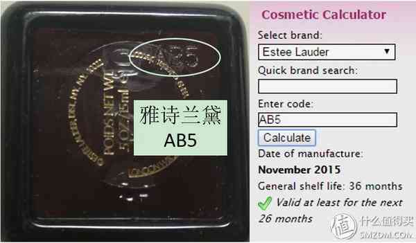 ▼美國品牌雅詩蘭黛的小棕瓶眼霜,瓶底顯示的生產批號為AB5,查詢得出其生產日期為2015年11月,shelf life也就是保質期是36個月,至今還有26個月的有效期。