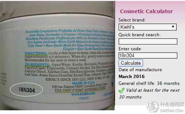 ▼下圖同樣是一個常見品牌,取Kiehls得亞馬遜白泥進行查詢,生產批號為18N304,得出其生產日期為2016年3月。