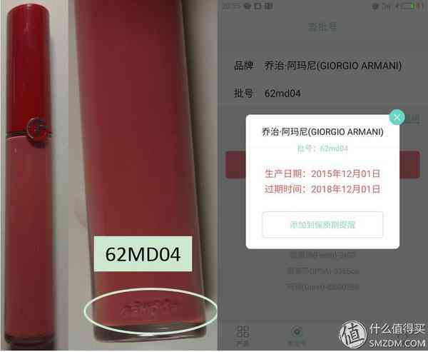 ▼阿瑪尼的唇釉,其批號為62MD04,其第三位碼M表示年份為2015年,第四位碼D表示月份為12月,則其生產日期為2015年12月。
