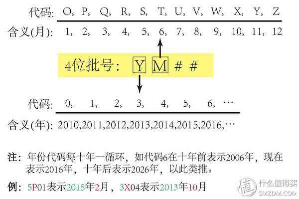 ▼這種6位碼的形式也比較固定,第三、四位表示了全部的生產日期信息。第三位表示年份,為字母形式,從2004年開始到如今的2016年,分別對應字母表中的A-N,其中2011年排到字母H,2012年按照順序本應是字母I,但因I與數(shù)字1相似而被跳過,其余均按照順序排列,如今2016年代碼為N;第四位表示月份代碼為1-9的數(shù)字或者O、N、D三個字母,其中O、N、D分別為英文十月October(十月)、November(十一月個)、December(十二月)的個字母;其余的第1、2、5、6位碼一般為數(shù)字形式。如62F301,其中第三位為年份代碼,表示2009年,3為月份代碼,表示3月,則此批號表示2009年3月。