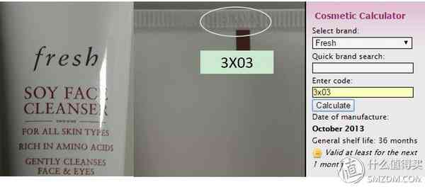 ▼Fresh的大豆?jié)嵜?,其批號?X03,位“3”表示年份2013年,第二位“X”對應月份10月,則此批號表示其生產日期為2013年10月。
