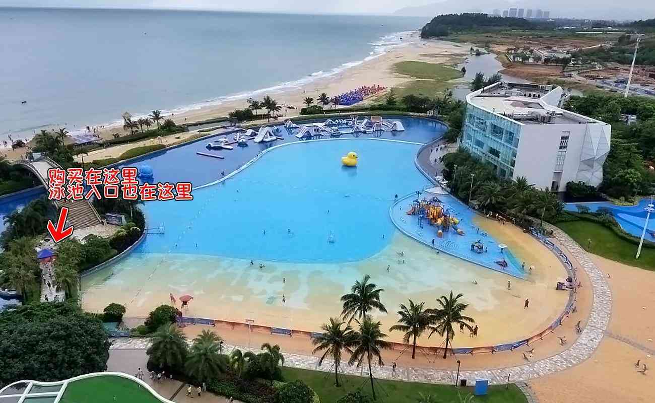 免費沙灘有快艇、高空飛傘、水上摩托等項目都要另外收費的;進游泳池沒有地方換衣服,也沒有保險箱記存東西;游泳池的門票還可以去1棟1樓前臺購買,價格便一點點;(圖)這個充氣游泳池是另外消費的,一小時25元,只能小孩進去,成年人門口看;