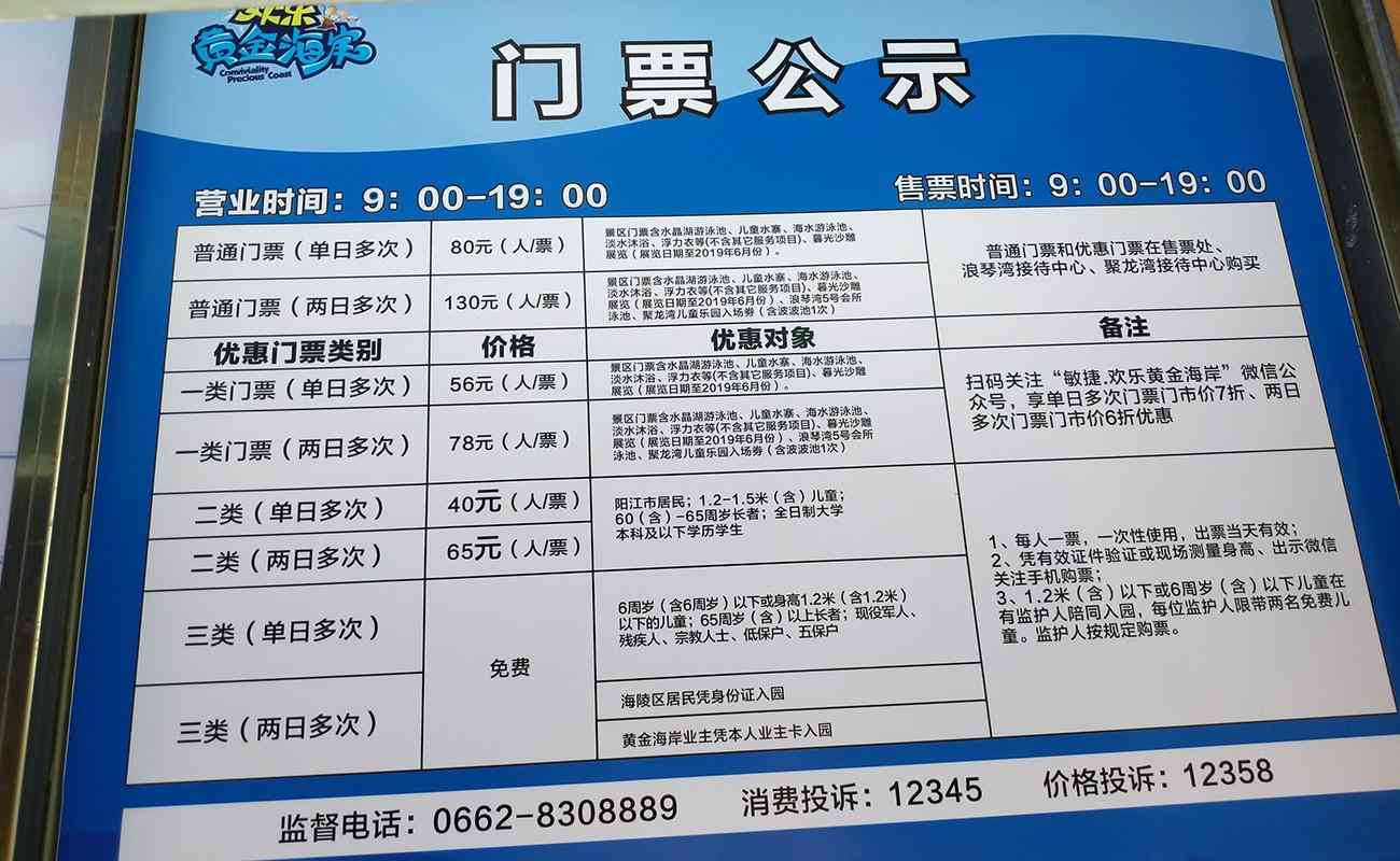 敏捷黃金海岸有兩個泳池和兩處沙灘,只有一處沙灘是免費的,泳池早上09:00開放,晚上19:00關閉,20:00后所有沙灘免費開放。購票的地方在第二處泳池旁邊,門票是一條帶有二維碼的紙條,分單次和多次、二日多次票(看下圖),說實話小編覺得老貴了。