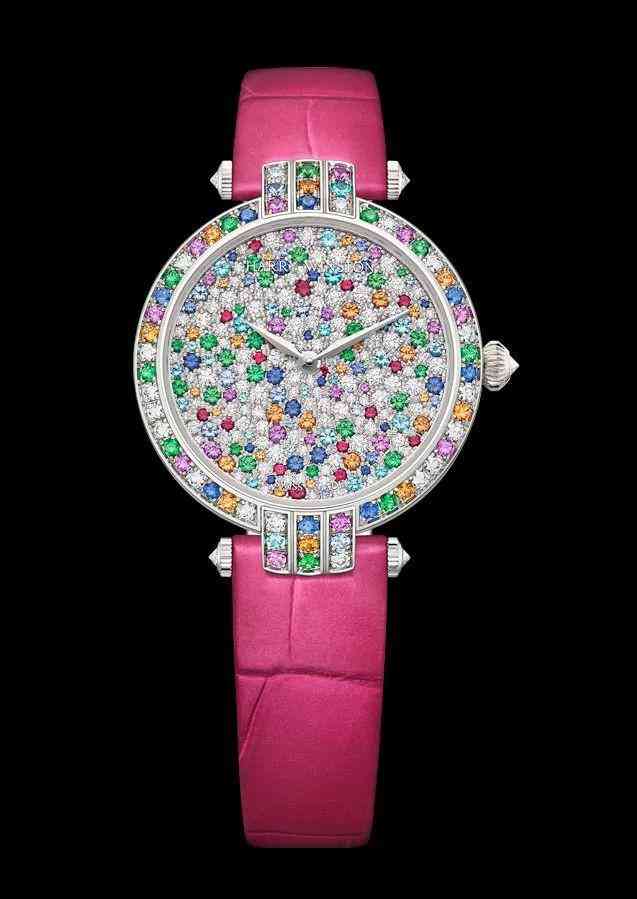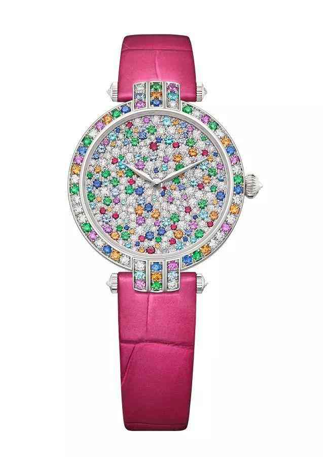 這枚腕表的表盤和表殼裝飾有八種糖果色的寶石,讓人想起小時(shí)候走進(jìn)糖果店的心情。