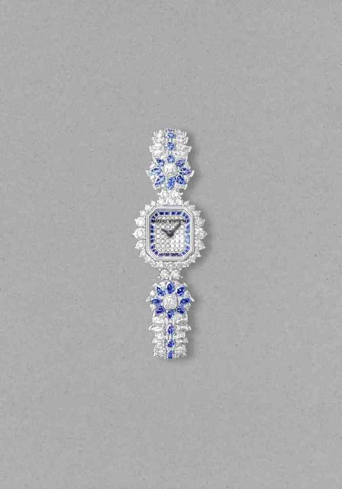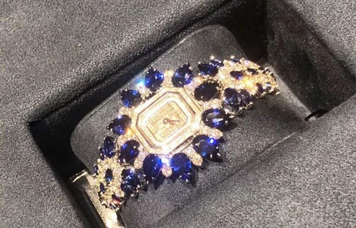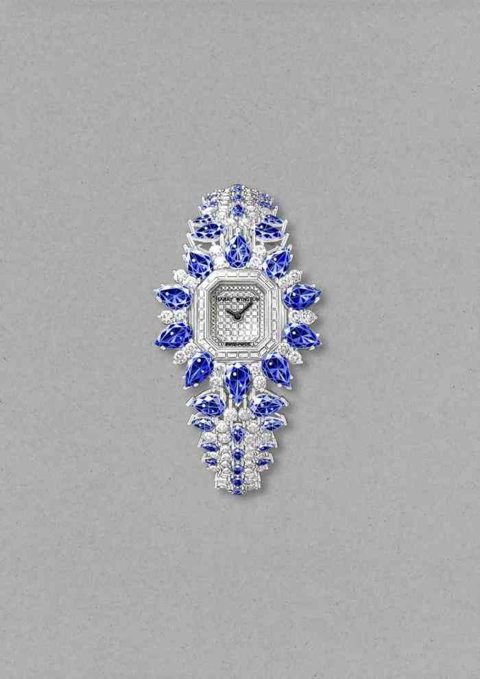 這一系列包括兩枚高級珠寶手鏈腕表,較大的一枚表殼鑲飾珍貴藍(lán)寶石和鉆石,星形圖案則由10顆水滴型切工藍(lán)寶石和成對鑲嵌的圓形明亮式切工鉆石組成。