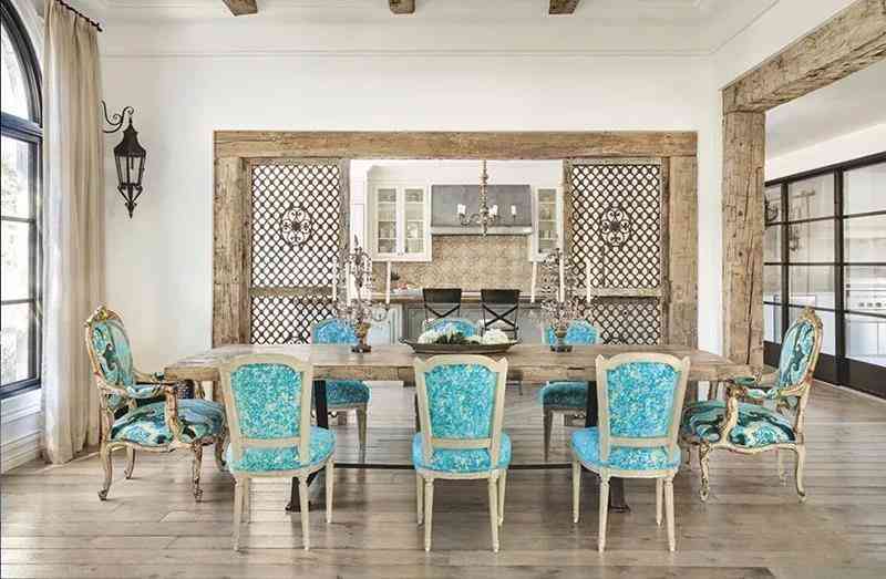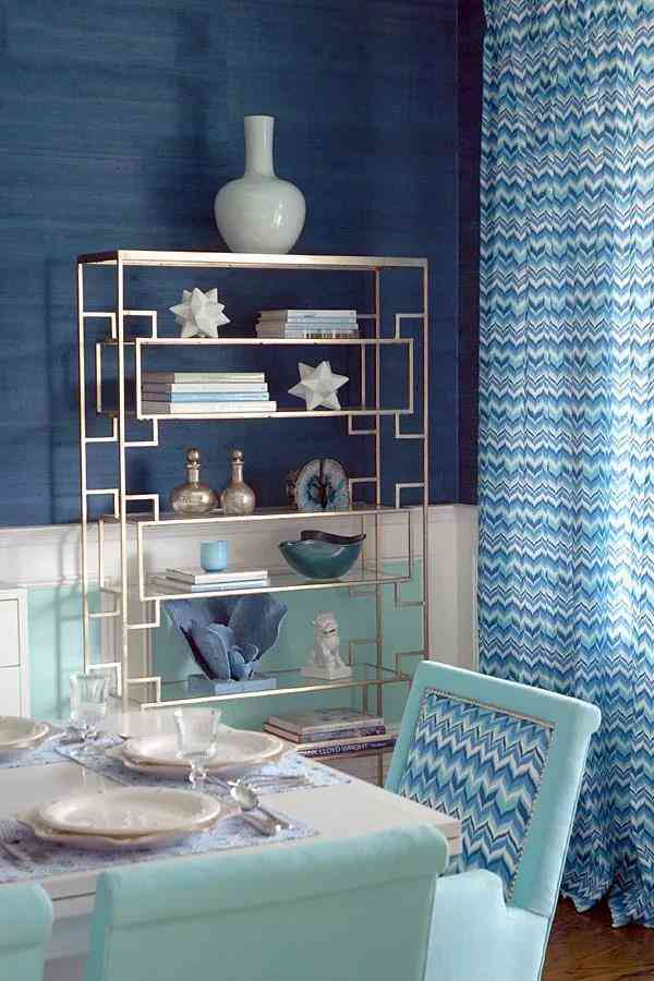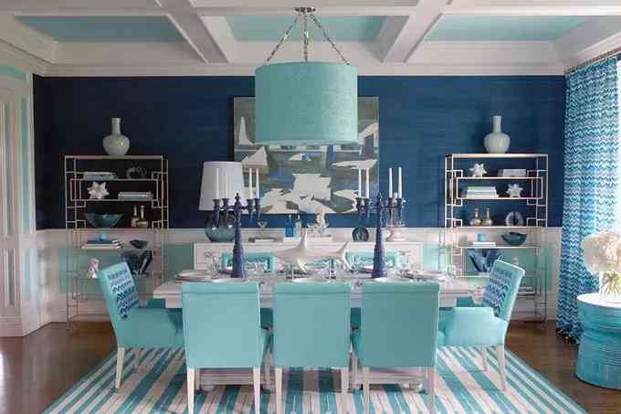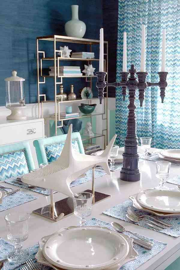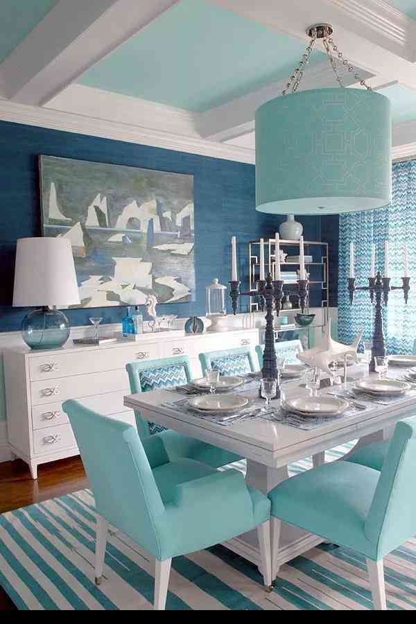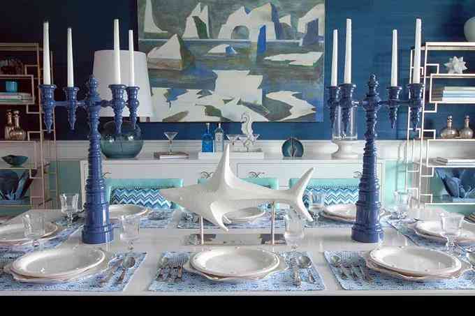 首先為空間擬定一個主題和要重點突出的風(fēng)格!很明顯地,整個餐廳的布置側(cè)重海洋風(fēng)情在陸地上的延續(xù),無論是餐桌上刻意裝飾的波浪紋路,還是重點陳列的鯨魚擺件,白藍交匯,海浪游魚,皆會讓人產(chǎn)生自然的聯(lián)想。海浪的波紋不僅散布于餐桌,餐椅以及窗簾都儼然成為浪花的載體,Tiffany blue與層層疊疊的藍色糅合聚散,曼妙而多姿,時尚的顏色在這一刻里擁有了無窮的生命力。